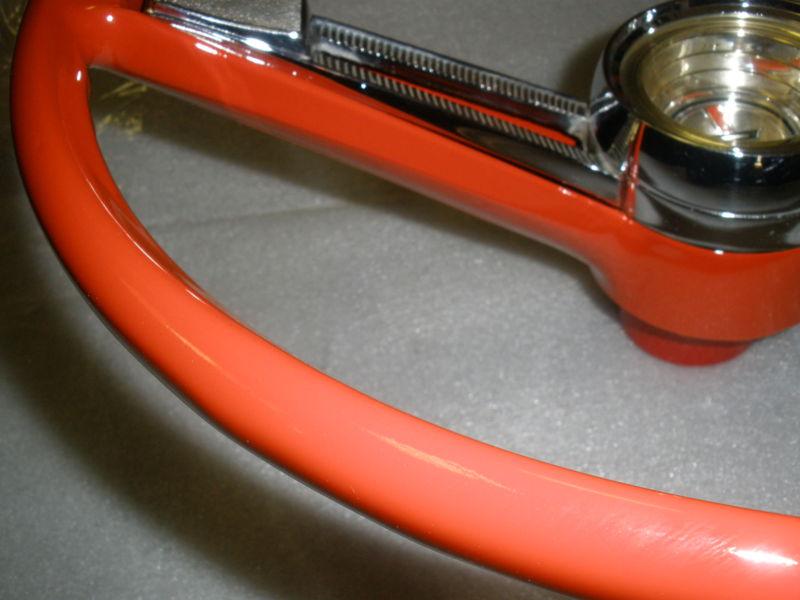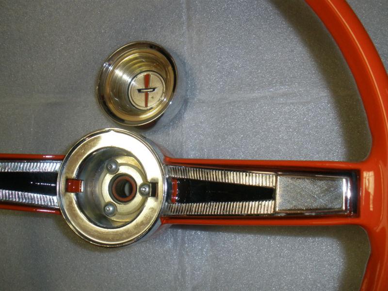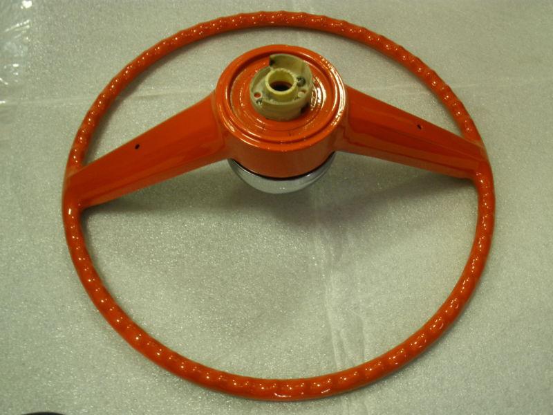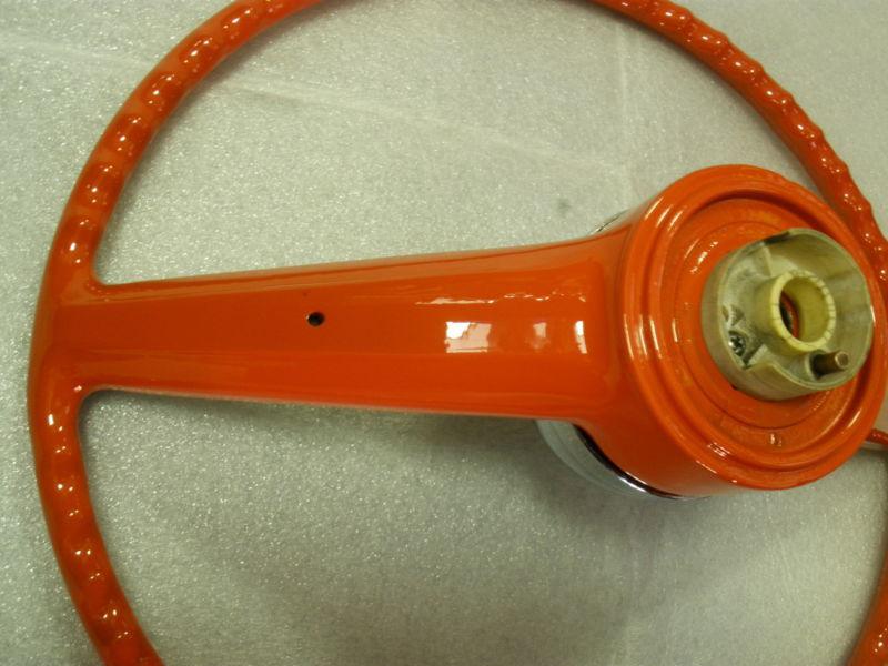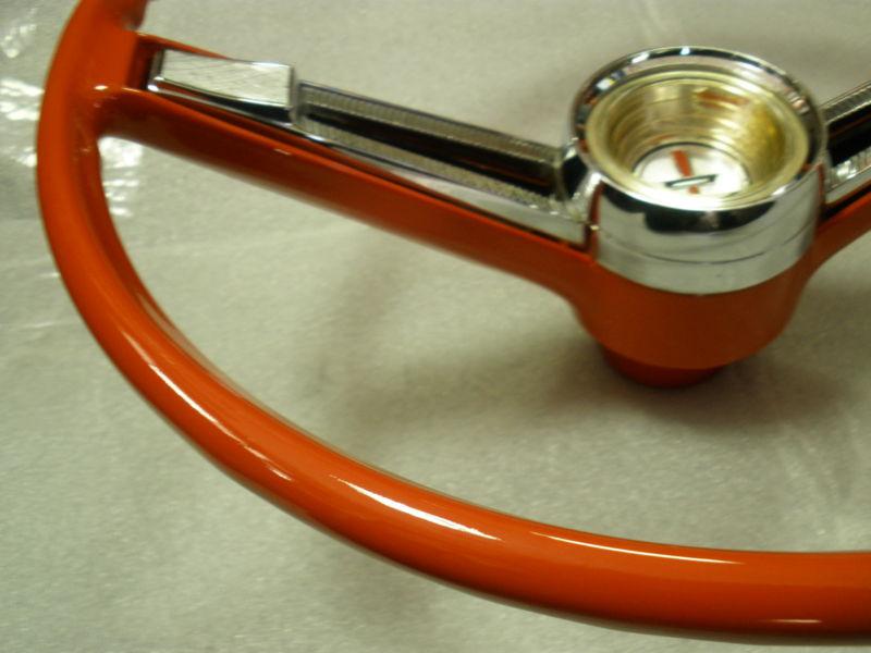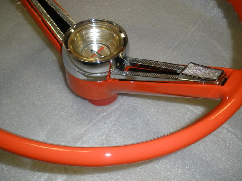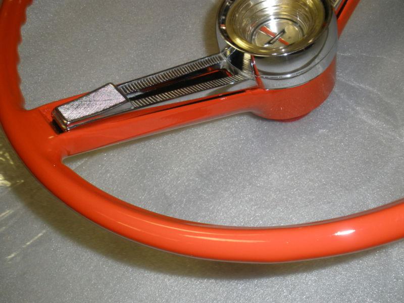 1962,63 Chevrolet Bel Air original, complete,and ready to be installed,wheel itself has been refurbished,primed,painted Chevy orange red,and black under the horn bar, clear coated for a real nice shine and protection,automotive,professional finishes were used, chrome horn cap shine very nice,some light pitting,horn mounting hardware are included,center cap is in very nice condition,with just a couple minor flaws,please take a good look at all the photos,most all angles are pictured,may work on other models,and years and any questions or concerns you may have please feel free to contact me,the wheel looks amazing,dont let it get away.Thanks for looking,and please take a look at my other auctions.