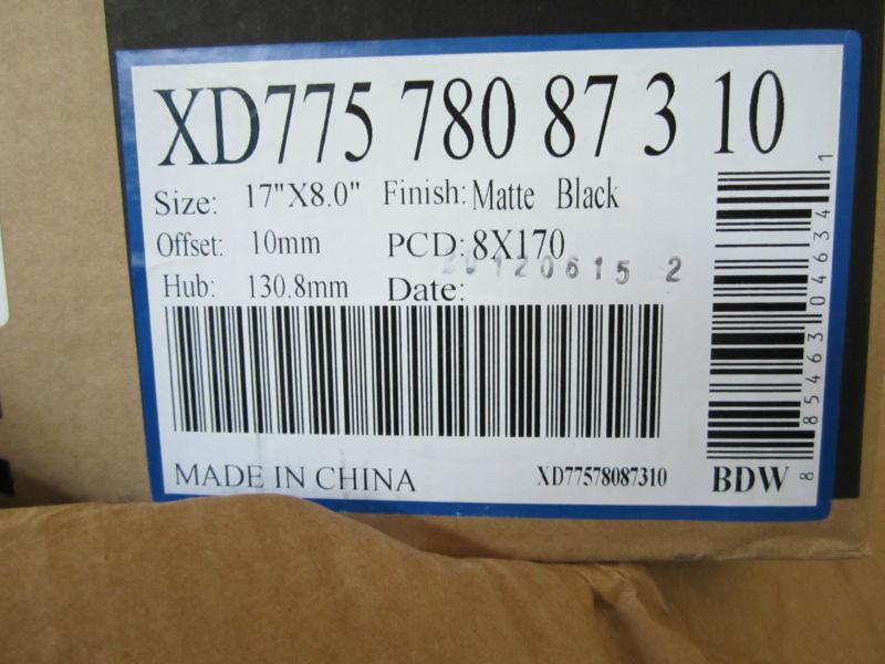 THIS IS A SET OF 4 BRAND NEW KMC XD SERIES ROCKSTAR WHEELS. 17 X 8 WITH MATTE BLACK FINISH. THESE ARE IN THE BOX AND HAVE NEVER BEEN INSTALLED. CENTER CAP AND MOUNTING HARDWARE INCLUDED. LUG NUTS AND SPECIFIC SOCKET ALSO INCLUDED. VALVE STEMS ARE NOT INCLUDED. FOR 2005 - 2012 FORD F250 AND F350 TRUCKS, EXPEDITION AND EXCURSION. THE COMPATIBILITY CHART ABOVE DOES NOT COMPREHEND AFTERMARKET WHEEL FITMENT. IF YOU ARE NOT SURE OF FITMENT, YOU ARE WELCOME TO STOP BY AND WE WILL CHECK FITMENT FOR YOU. WE ARE A FULL SERVICE GARAGE LOCATED IN ABINGTON, MASSACHUSETTS, 02351. ******NO SHIPPING******THIS IS LOCAL PICKUP ONLY AT THIS TIME DUE TO SIZE AND WEIGHT. GREEN CURRENCY GLADLY ACCEPTED AT PICKUP TIME. ANY QUESTIONS? CALL MIKE CAMPO @ 781-878-0682 FOR MORE INFO. THANKS.
