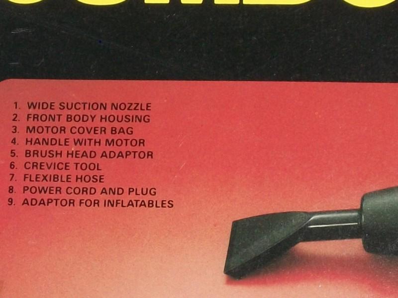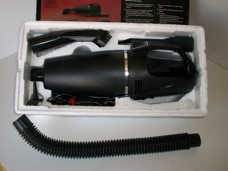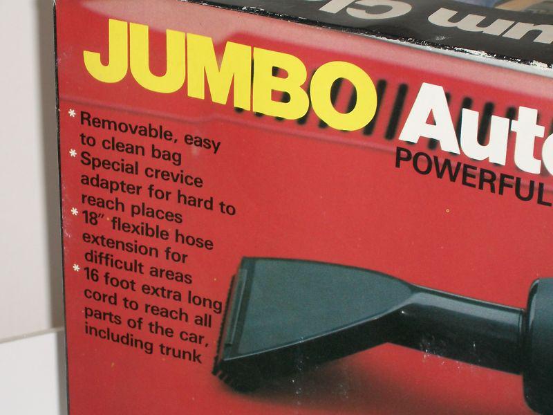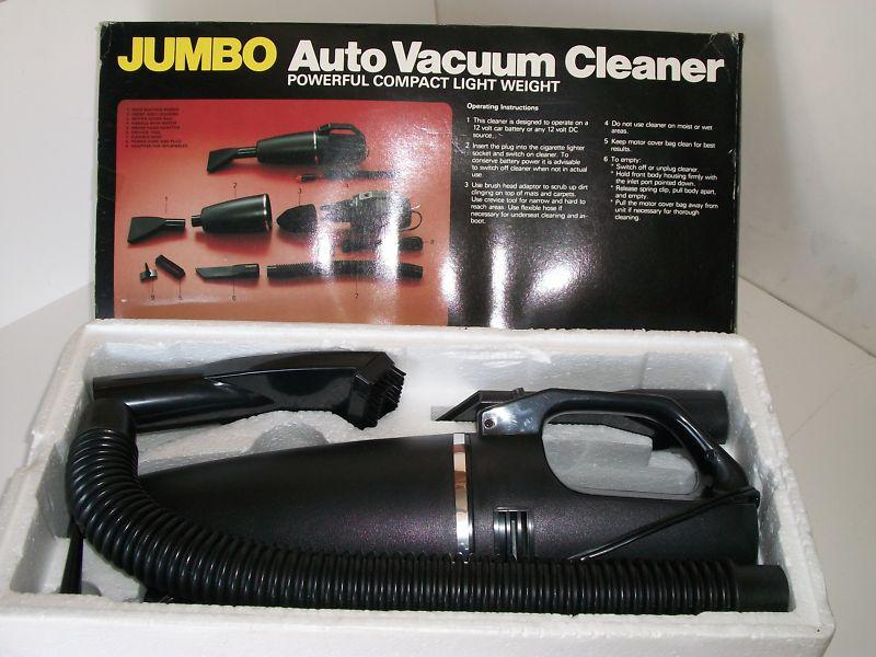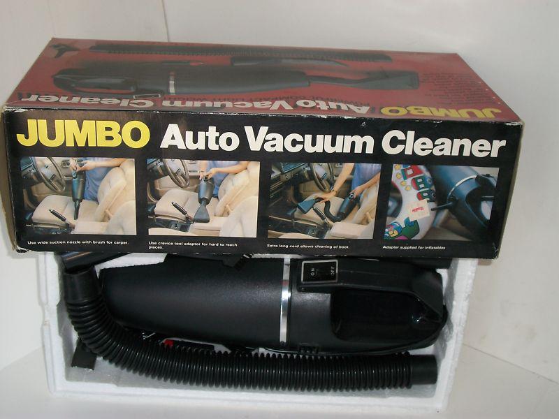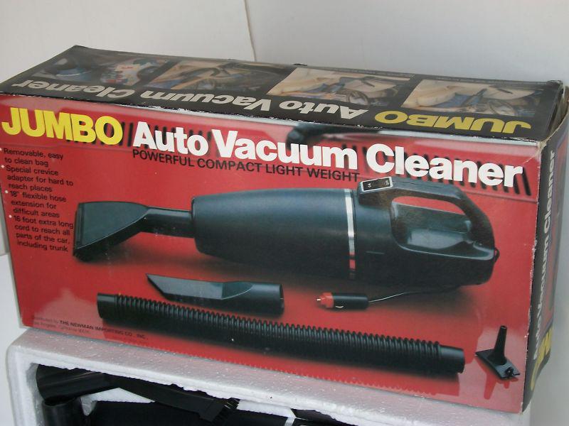 Jumbo 12-volt Auto Vacuum Cleaner, in original box and packing. Works. Used very little if at all. Has been in storage for at least 13 years. Has 4 attachments. Assembled body is approximately 15" long. From Newman Importing, made in Hong Kong. British register # 993827. Instructions are on the box. Has price tag from Thrifty for $9.99.