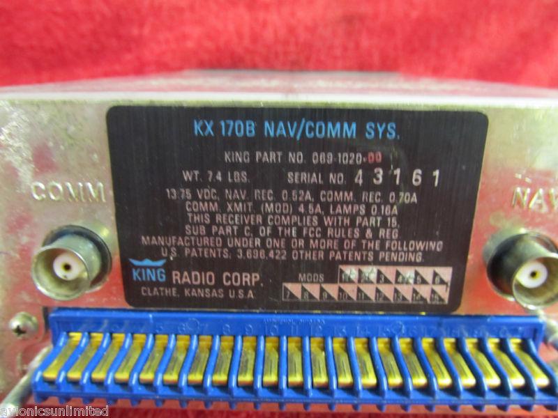 **USED****WARRANTY** 14V BENDIX KING MODEL KX170B NAVCOM PART NUMBER 069-1020-00 SERIAL NUMBER 43161 Removed during a recent panel upgrade in working condition. As the pictures indicate, the unit is in good condition and has been through our shop where it was tested to manufacturer's specifications prior to the auction. Auction is for unit only but mounting racks and connectors are available in the used market. Includes a current FAA form 8130-3 return to service document and a 90 day warranty. We prefer PAYPAL as it is the fastest and safest way to pay for your auction. We will also accept payment by any major credit card EXCEPT AMERICAN EXPRESS. The domestic shipping and insurance for this item within the United States by UPS Ground is included in the buy-it-now price. Expedited shipping is available. You can reach Avionics Unlimited, Inc. toll free Monday through Friday 8:00 AM to 5:00 PM CST at 1-866-703-6388.