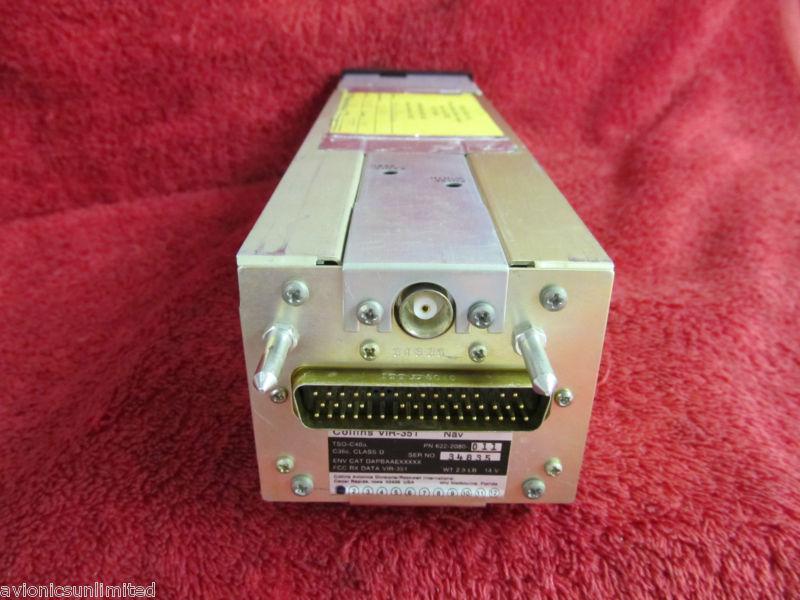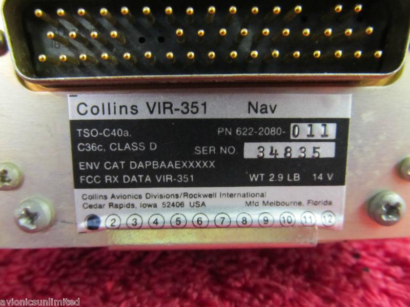**USED****WARRANTY** 14V COLLINS AVIONICS MODEL VIR-351 NAVIGATION RECEIVER PART NUMBER 622-2080-011 SERIAL NUMBER 34835 Removed from a one owner aircraft during a recent panel upgrade in working condition. As the pictures indicate, the unit is in very good condition and the panel is free of any cracks which is common to these units. It has been through our shop where it was tested to manufacturers specifications prior to the auction. Auction includes mounting rack, connector, installation drawing, and a current FAA form 8130-3 return to service document. Unit is guaranteed for 90 days from purchase. We prefer PAYPAL as it is the fastest and safest way to pay for your auction. We will also accept payment by any major credit card EXCEPT AMERICAN EXPRESS. The domestic shipping and insurance for this item within the United States by UPS Ground is included in the buy-it-now price. Expedited shipping is available. You can reach Avionics Unlimited, Inc. toll free Monday through Friday 8:00 AM to 5:00 PM CST at 1-866-703-6388.