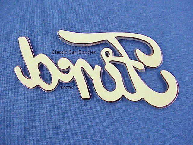 Chrome "FORD" Script. Peel-n-Stick. (1) How about this brand new die cast metal chrome emblem for your favorite Ford? It doesn't have to be a 1940 either. It is the peel and stick version. Can't get any easier than that! It is 3 1/4" wide and 1 1/2" tall. This listing is for 1 emblem as shown. Happy Cruisin'. Lots of neat stuff in the Classic Car Goodies Store (currently over 1,000 items!). Call customer service at 303.317.4281 if you have a question.