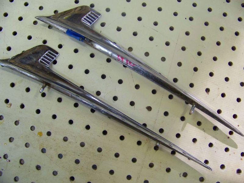 1958 Chevy Impala fender ornaments. Original, straight, one ornament has mounting stud broke free. Separated stud comes with, it`s in blue tape as seen in photo. Epoxy glue, man cave, treasure! Needs proper cleaning/polishing. I accept Paypal only and expect payment within 3 days. I ship lower 48 USA only. I can combine shipping so check out my other items for bid. Good luck.