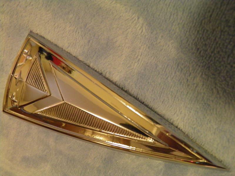 LIKE NEW TRUNK(?) SCRIPT (BADGE, ARROWHEAD, SPEAR) FOR A '62 FULL-SIZE (P/8) PONTIAC. YOU ARE THE EXPERT AS TO WHETHER PART # 4846515 FITS ALL THE BIG MODELS (INCL. GRAND PRIX?). ET CAVEAT EMPTOR IS INVOKED ON THAT ONE. THIS IS IN STUNNING CONDITION, AND ANY TINY EDGE PITS ARE MINISCULE. WAS INSTALLED BRIEFLY ON A CATALINA; THERE'S NO PAINT ON IT. I'M ALMOST POSITIVE IT'S FOR THE TRUNK, BUT IT LOOKS THE SAME AS THE ONE INSTALLED ON THE GRILLE PROBISCUS (NOSE). ALL SELF-TAPPING NUTS ARE INCLUDED, AND THE TITS ARE IN EXCELLENT SHAPE. HARD-TO-FIND PART IN THIS CONDITION... SHIPPING/PACKING: BECAUSE I'M IN THE CORNER OF THE COUNTRY, SHPG COSTS MAY BE A BIT MORE. SETS OF LARGE HUBCAPS (AND LARGER ITEMS) MAY BE DIMENSIONALLY WEIGHTED (i.e., charged more than actual weight) BY UPS IN ANY BOX 16”x18”x18” OR LARGER (> 5183 TOTAL INCHES). I DON’T CHARGE A SEPARATE HNDLNG FEE, SO WHEN YOU SEE THE EFFORT I WENT THROUGH TO PACK THIS ORDER, YOU'LL THINK IT'S A BARGAIN. I WILL COMBINE SHIPPING, IF ITEMS CAN BE SHIPPED TOGETHER SAFELY (by deducting approx. 50% of the lesser shpg cost for each additional item). NOTE THAT I CAN’T ADD THE EXTRA CHARGES IT COSTS ME FOR A BUYER’S RESIDENTIAL DELIVERY OR RURAL RSDNTL, INSURANCE, AND FUEL SURCHARGE, AND I PAY A COMMISSION OUT OF THE SHPG PRICE. SO I’M OFTEN UNDERSTATING THE ACTUAL OUT-OF-POCKET COST IN THE QUOTE. ALSO, IT IS MY PREROGATIVE TO USE A DIFFERENT SHIPPER THAN THAT LISTED IN THE AUCTION (e.g., U.S.P.S. instead of U.P.S.), IF I FEEL THE ITEM CAN BE TRANSPORTED MORE EFFECTIVELY BY OTHER MEANS (i.e., more cheaply, or in pre-fab cartons, such as those used by U.S.P.S.). IN THE MEANTIME, IF YOU HAVE ANY QUESTIONS, PLEASE FEEL FREE TO CALL ME AT ANYTIME: 6one9-442-2800. PLEASE LEAVE A MESSAGE IF I CAN'T GET TO THE PHONE! THANKS VERY MUCH FOR YOUR INTEREST & COOPERATION... INTERNATIONAL BUYERS: WELCOME! IF THE SHPG QUOTE SEEMS A LITTLE HIGH, PLEASE CONTACT ME BEFORE BIDDING. IT TAKES ME QUITE A BIT OF EXTRA TIME TO SEND A PKG OUT OF THE U.S.; A VERY NOMINAL HNDLG CHARGE’S BEEN ADDED. I WILL SEND PHOTOS OF PACKAGING DETAIL (IF REQUESTED). LAYAWAY OPTION & PAYMENT TERMS: YOU MUST MAKE A PAYMENT FOR THIS ITEM (at least 50% down) WITHIN 48 HOURS. I WILL ALLOW UP TO 30 DAYS (90 days, if pre-arranged) FOR THE BALANCE DUE TO BE PAID. Thank you for your cooperation... FEEDBACK: MY REWARD IS THE SATISFACTION OF HAPPY BUYERS, AND MY GOAL IS TO ACHEIVE 5 STAR RATINGS. IF THERE IS ANY DELAY IN SHPMT, PLEASE CONSIDER HOW WELL I PKGD THE ITEM(S). I’VE BEEN KNOWN TO DOUBLE-BOX, USE DOUBLE-WALL BOXES, & WRAP THINGS 3 DIFFERENT WAYS. IN 34 YRS OF SHPG, I’VE RARELY EVER HAD A DAMAGED SHPMT! FYI: IN 2011, I DONATED ALMOST HALF OF MY YEAR’S EBAY SALES RECEIPTS TO THE JAPAN EARTHQUAKE & TSUNAMI RELIEF FUND…
