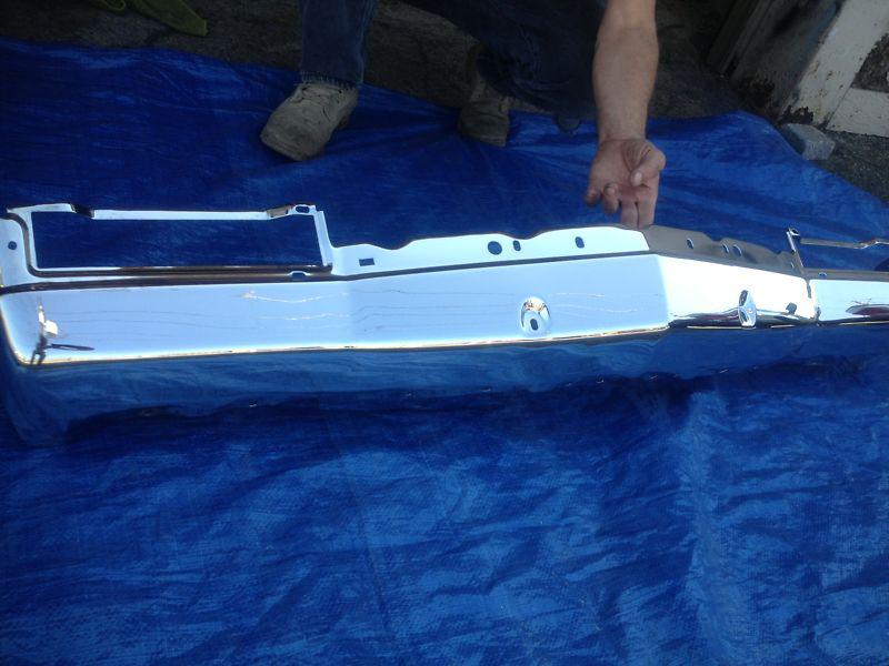 SHARP BUMPER. NO CORE NEEDED. SOME OF THESE BUMPERS I HAVE LISTED MAY HAVE SMALL SPOTS FROM BEING IN WAREHOUSE SO LONG BUT THEY ALL LOOK GREAT ON CAR AND VERY INEXPENSIVE. I HAVE MARKED WERE THE PROBLEM IS AS BEST AS I CAN. I THINK THIS ONE IS NEW BUT I AM SELLING IT FOR REPLATE. BRIGHT CHROME, TODAYS COSTS 675.00 PLUS GOOD CORE. NOT SURE OF THE YEARS THIS FIT, MAKE SURE YOU KNOW BFORE BIDDING, ( PLEASE CLICK ON ( SEE ALL ITEMS ) FOR OTHER LISTINGS. THANK YOU, THESE BUMPERS ARE A STEEL AT THIS PRICE.