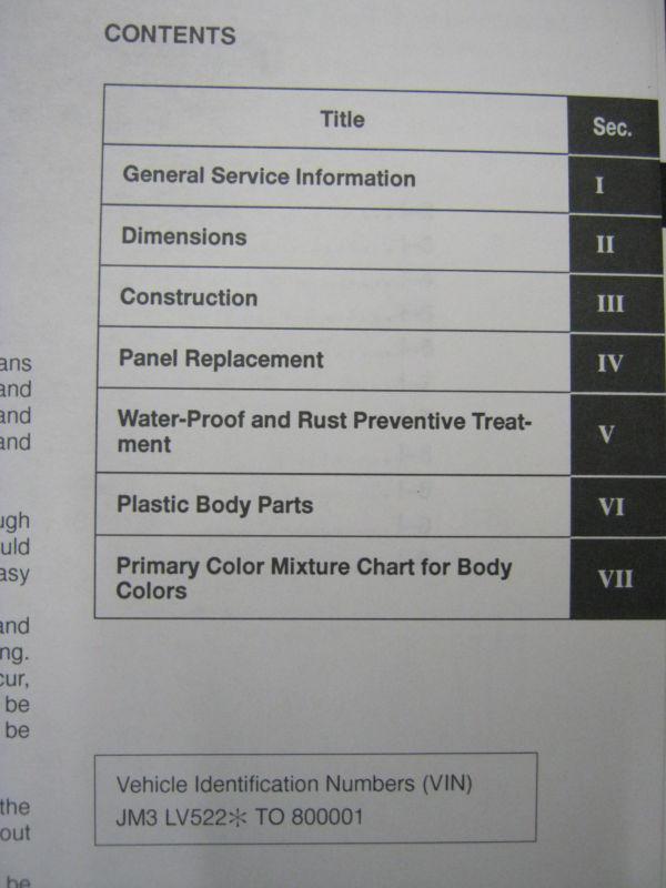 Factory authorized OEM 1996 Mazda MPV Bodyshop Manual. In used condition, all pages are intact however, this manual may show some wear and tear as it was once used at a Mazda dealership. This comprehensive manual covers all the information you will need to efficiently replace all body panels and proper insulation information. Subjects covered in this book include: