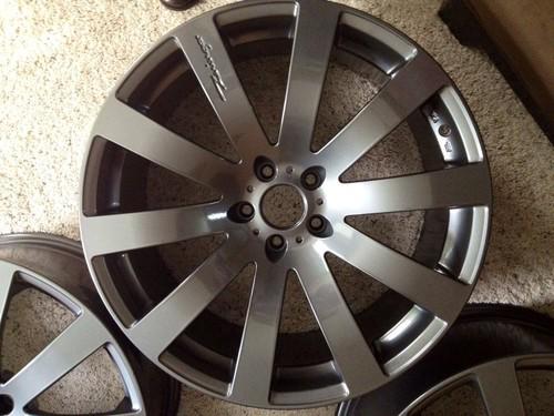 The two drivers side wheels had the original clear coat scratched in a car wash from the wheels track so I had all four wheels chemical stripped and then powder coated using Prismatic Powder (prismaticpowder.com) brand "Ultra Black Chrome" color powder and clear. They have never had tires or valve stems installed or been mounted since the powder coating job.