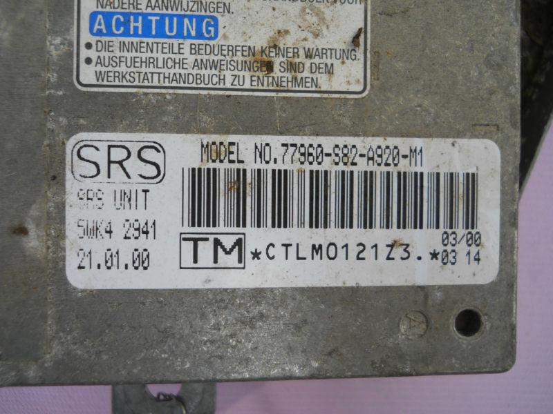 THIS IS A GOOD USED SRS AIRBAG COMPUTER MODULE FOR A 1998 1999 2000 2001 2002 HONDA ACCORD 2 DOOR COUPE. THIS WAS PULLED FROM A 2000 HONDA ACCORD 2 DOOR COUPE, AND WAS TESTED ON 09/29/2013 AND IS IN GOOD WORKING CONDITION. THE ITEM PICTURED IS THE ACTUAL ITEM YOU WILL RECEIVE. PLEASE MAKE SURE YOUR PART NUMBER MATCHES UP THE OEM PART NUMBER IS 77960-S82-A920 .