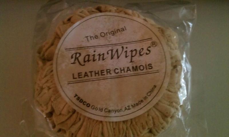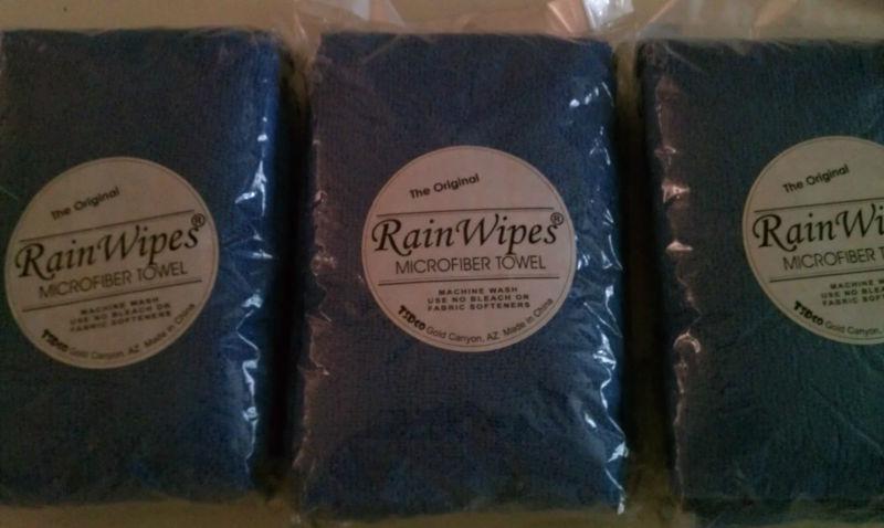 3 NEW IN PACKAGE, THE ORIGINAL RAIN WIPES MICROFIBER TOWELS. ALL ARE DARK BLUE. THE PACKAGE MEASURES ABOUT 4 INCHES WIDE BY 6 INCHES TALL. ALSO 1 THE ORIGINAL RAIN WIPES LEATHER CHAMOIS, ALSO NEW IN PACKAGE.