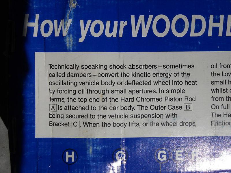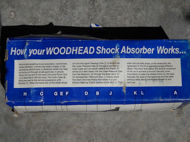 New set of four genuine Woodhead Made in England rear shock absorbers (dampers), Jaguar p/n C.22847, suited for Jaguar 3.4S 3.8S 420 Mark X 420G. Includes a new set of split keepers (retainers), Jaguar p/n 8687. The box has seen better days, but the shocks are new and never mounted. Note: This is a set of 4 rear shocks. See my Other Auctions for a front pair. Shipping weight ~16 lbs. Don't settle for repro parts! The Fine Print Yes, I combine shipping on multiple purchases within a reasonable timeframe shipped in the same box. All domestic shipping charges include insurance and delivery confirmation. Prompt payment is greatly appreciated! Items for which payment is received before 8 p.m. Pacific time usually go out the next business day. No returns unless I accidentally sent you the wrong item. International Buyers: Payment must be in US$. Currency conversion fees will be added for any others. Significant additional postage may be required - if this may be a concern, ask for a shipping quote before you bid! A $10 international documentation fee is included for all international shipments since I must fill out customs documents and stand on queue at the post office to ship your package. Feedback: If you wish to receive Feedback, you must first leave Feedback for me so I know that you have received and are satisfied with your purchase. I promptly respond with glowing praise for every buyer who leaves me Feedback.