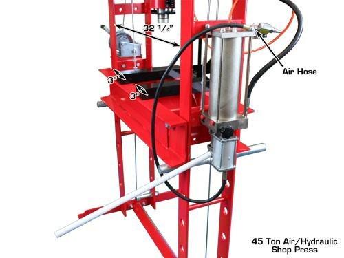 The 45-ton heavy duty H-frame shop press utilizes an air/hydraulic power