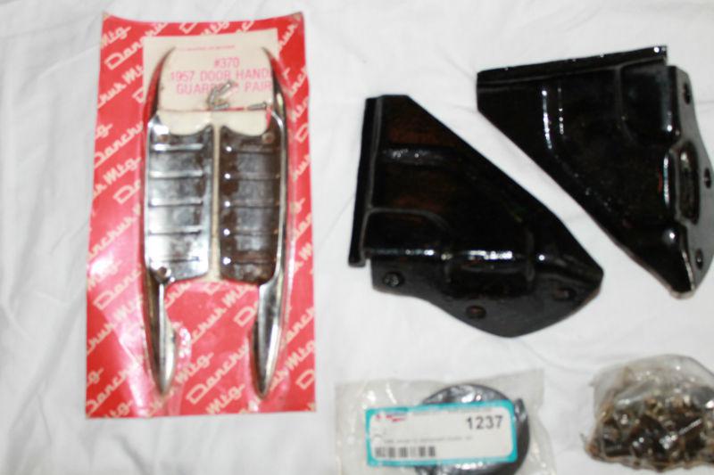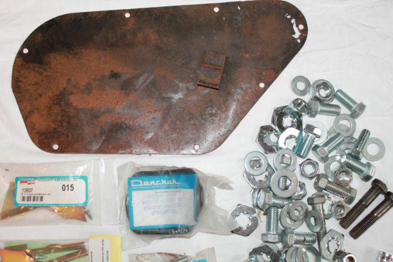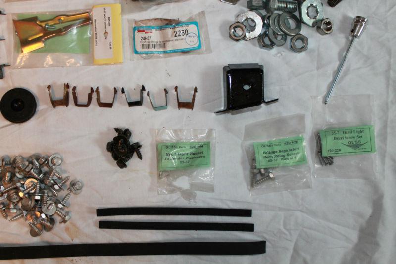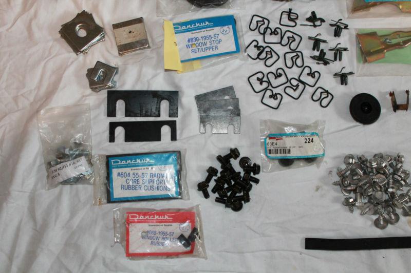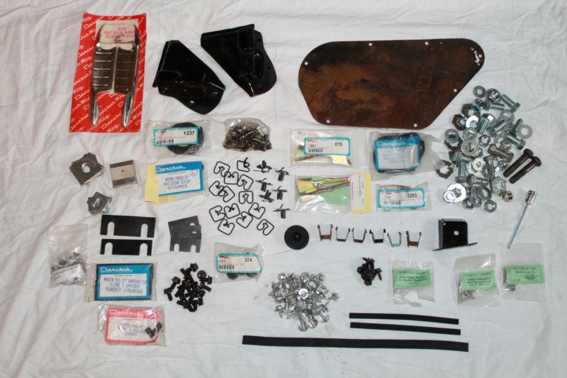 An assortment of fender screws, body bolts, shims, battery bracket, interior door cover, gaskets, plugs, molding clips, glass clips, head light knob, and door handle cover. All parts are new and most are from Danchuck. Feel free to e-mail me with any questions.