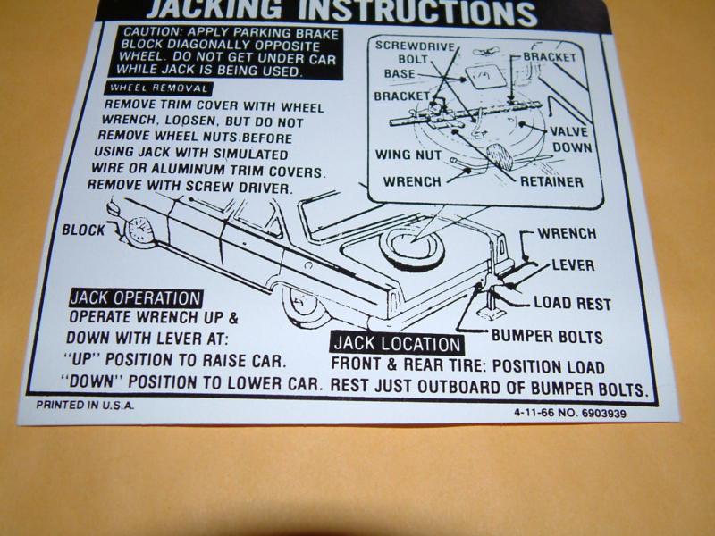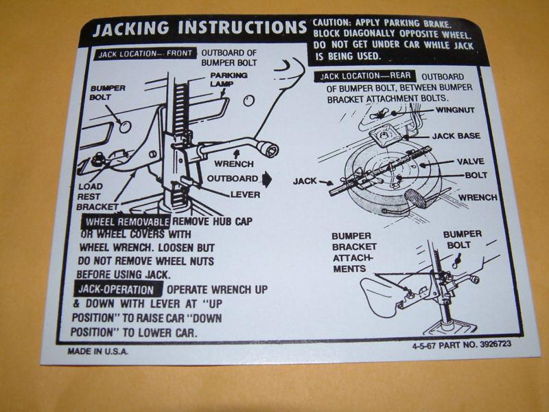 YOU ARE BIDDING ON A NEW REPRODUCTION TRUNK JACKING INSTRUCTION DECAL FOR NOVAS,: YOU HAVE A CHOICE OF THE CORRECT DECAL TO FIT THE FOLLOWING YEARS: 64 65 FIRST PICTURE OR 66 SECOND PICTURE OR 67 THIRD PICTURE OR 68 69 FOURTH PICTURE OR 70 71 NO PICTURE PLEASE SPECIFY YEAR WHEN PAYING NEED SOMETHING YOU DON'T SEE LISTED? I ONLY LIST A FEW OF MY ITEMS HERE , I STOCK OR CAN GET MAY OTHER ITEMS. SOFFSEAL WEATHERSTRIPPING & SEALS, PAINT DETAIL AND BUMPER KITS, PEDAL PADS ETC. I ALSO STOCK MANY RESTORATION DECALS, AIR CLEANER , EMISSION, TIRE PRESSURE AND JACKING INSTRUCTION DECALS TO NAME A FEW. WINNING BIDDER TO PREPAY WITH PAYPAL AND INCLUDE THE APPROPRIATE TAXES FOR YOUR PROVINCE. I WILL GLADLY COMBINE SHIPPING, I PREFER TO DO IT PERSONALLY FOR EACH INDIVIDUAL SALE, INSTEAD OF THE AUTOMATED ADDING OF A SET AMOUNT PER SALE A NOTE ABOUT SHIPPING CHARGES..I WILL NOT JUST THROW MY DECALS IN AN ENVELOPE AND HOPE IT ARRIVES OK...EVERYTHING IS PACKAGED IN A BUBBLE ENVELOPE WITH A STIFF FOAMBOARD BACKER, TO INSURE IT ARRIVES SAFELY, BUT ALSO COSTS MORE TO PACKAGE AND SHIP... THANKS GARY ITEMS ARE IN CANADA AND SHIPPED FROM CANADA..THE PRICE YOU SEE INCLUDES THE BROKERAGE CHARGES AND DUTIES.THEREFORE YOU WILL NOT GET A BILL FOR BROKERAGE CHARGES WHEN YOUR PARTS ARRIVE THANKS |