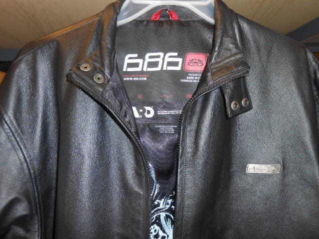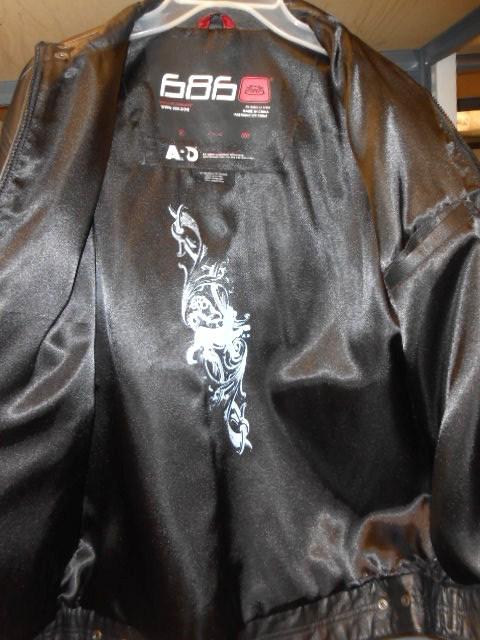 Up for auction is Men's size L 686 leather jacket with white accent near pockets and on sleeves. Very good condition, with only slight wear on interior ( hole in interior from cutting tag off). Previously owned but hardly worn. Leather is in very good condition.