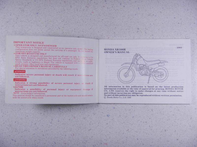 93 Honda Xr100r Nos Oem Original Driver's Owner's Manual on 2040-parts.com