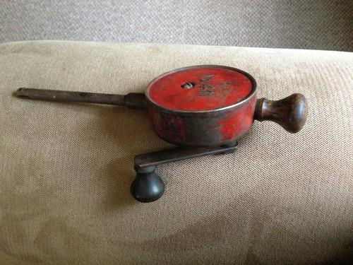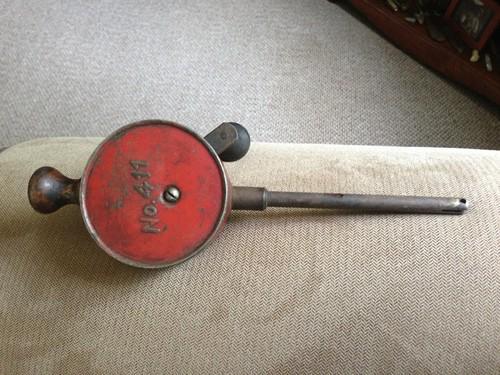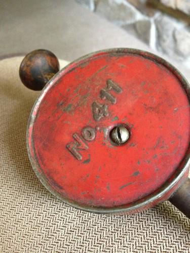 Up for auction is a vintage piston grinder from what I believe is from the 1940s. It is comprised of metal with ; wood knobs, painted with red painted metal on the back of the grinder, there is a No. 411 marking. I purchased this at a tool auction . I just liked the way it looked. I had no idea what it was but; an older gentleman said that it was a piston grinder. That's all that I know! It is 10" tall, 3" wide and the handle turns freely and knobs are in great shape.