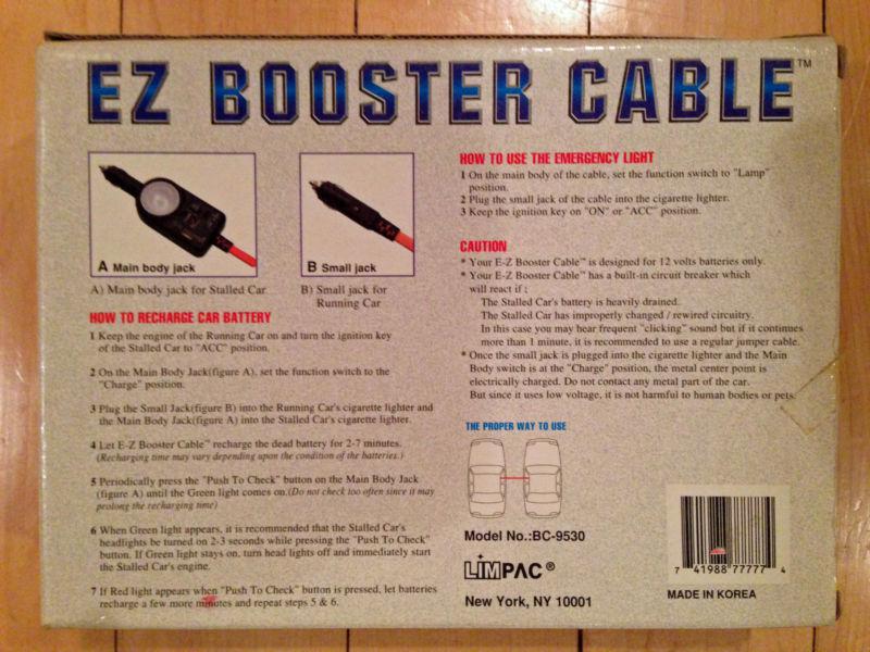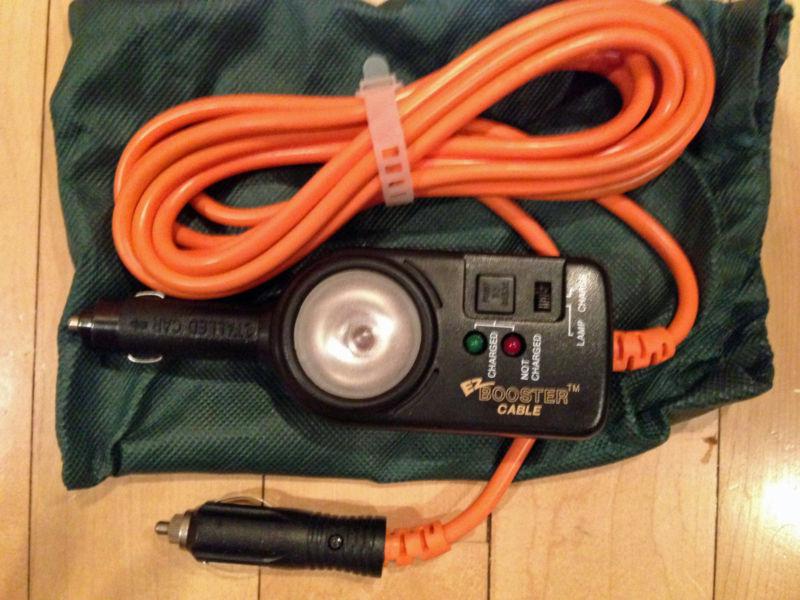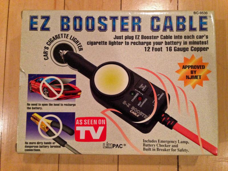 This EZ Booster Cable is new and unused. The original box shows some wear. The carrying bag and operating manual are included. Uses the cigarette lighters in the host and receiving vehicles for battery charging.