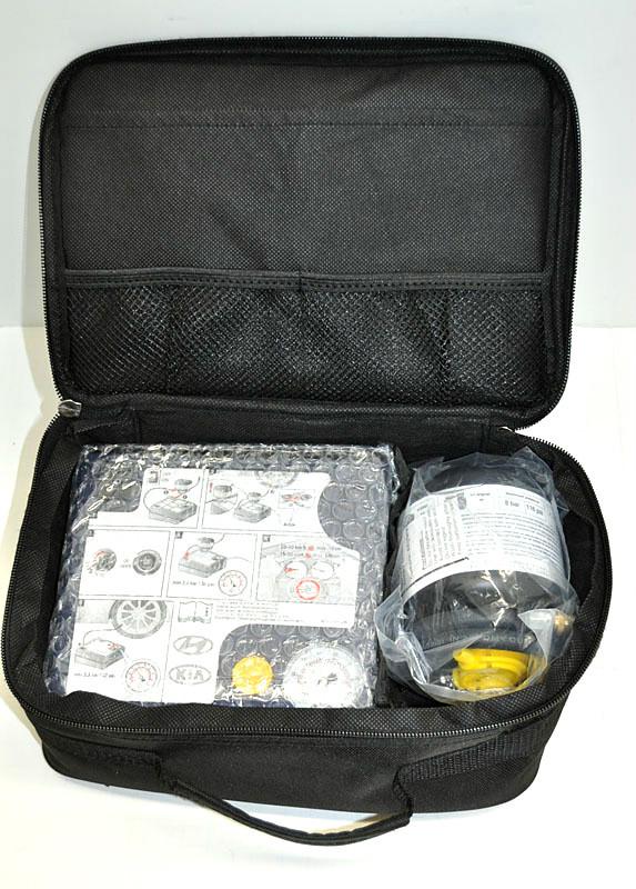 This kit is 3 pieces; pump, sealant and double-zippered, soft sided carrying/storage case with handle. Like New with instructions. The last photo gives an illustration only of how it would work. This does not come with original box and the case is not in individual packaging material.