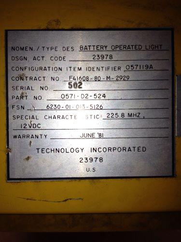 Technology inc light part# 6230-01-013-5126 looks to be used military salvage been on a shelf for a few years . Unable to test . As is USA only