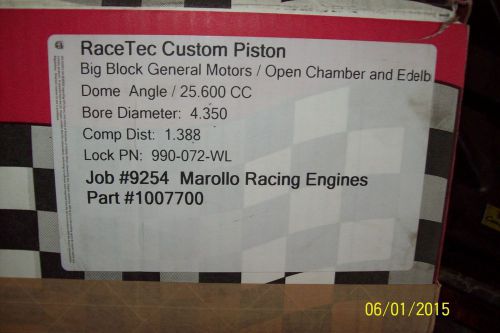 You are looking at a set [8] of BBC Race Tech piston without wrist pins which are .990 x 2.930. The info sheet is pictured along with info below, we will gladly answer any questions. Ship to continental United States only with no over seas shipping,call us on Alaska. These are as is without warrantee, thanks for looking and like us on Facebook! 4.00 stroke, 6.385 conn rod 10.34-1 compression with the rings being 043,1/16 and 3mm 1.385 compression height.....119 cc head at zero deck zero deck @ 9.773........476 C.I. Marollo Racing Engines Inc. 6 Kent Rd Pine City NY, 14871 PH. 607-734-2148 NYS sales tax when applicable. |