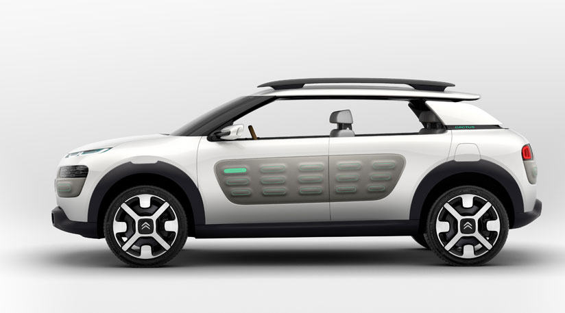 The concept runs a version of PSA Peugeot-Citroen’s hybrid compressed air drivetrain, which boosts economy to a claimed 94mpg. Thanks to the lack of batteries that are associated with an electric hybrid, the Cactus suffers to cabin space impingement from its hybrid heart, and still gets away with a 45% reduction in fuel consumption during urban driving.