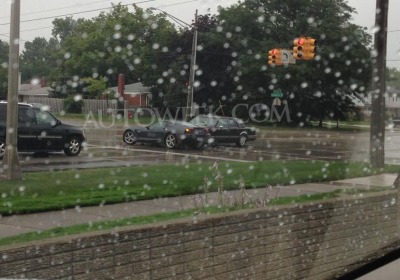 While it's difficult to tell the status of either car from the photo, the absence of significant damage on either car indicates it was probably a fairly low-speed collision in slick conditions -- we hope the occupants of both cars are safe and uninjured.
