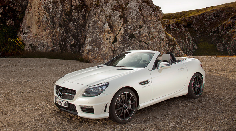 So the badge finally corresponds to the engine size? This Mercedes SLK55 AMG actually has a 5.5-litre V8?That's right. It's a naturally aspirated version of twin-turbo 5.5-litre V8 that powers the E63, CLS63, CL63 and S63 AMG models. And alongside the 416bhp there's also 398lb lf, and some very impressive fuel figures. Thanks to an Eco mode for the seven-speed MCT gearbox, stop/start tech, and a cylinder deactivation system that can see the SLK55 run with four-pot power, the official figures are 33.6mpg and 195g/km CO2. Not bad for an eight cylinder sports car that will hit 62mph in 4.6seconds and go on to a (limited) top speed of 155mph.