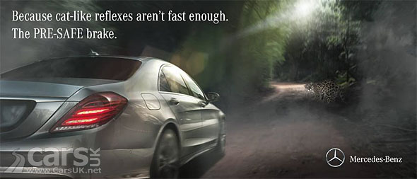 The response from Mercedes is a single photo posted on Facebook showing a Mercedes bearing down on a Jaguar (cat) ahead with the simple tag line “Because cat-like reflexes aren’t enough. Mercedes PRE-SAFE Brake”.