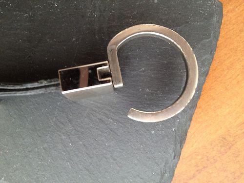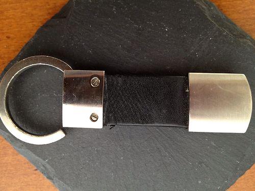 This auction is for a BMW brand black leather/stainless steel keyring. It has not been used. I bought it and two others for my husband and he just hasn't used it. But the key ring does have some dents around the edge and there is a small tag of leather along the edge that has pulled away. These are not real noticeable but I wanted to make sure that I mentioned it.