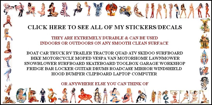 SEXY SAILOR BABE RETRO TATTOO STYLE PIN-UP GIRL Sticker/Vinyl Decal Art by FLUFF Sticker is printed on transparent Vinyl It measures 5 1/4 inches high by 4 1/2 inches wide ......... BRAND NEW MINT CONDITION GREAT FOR COLLECTORS High Quality Non-Fade VINYL Stickers/Decals All of my Decals are printed on Transparent Vinyl***UV RESISTANT ** NON FADE*** ***WEATHERPROOF *** ***WATERPROOF *** *** PROFESSIONAL QUALITY *** ** DURABLE ** TRANSPARENT VINYL ** High Quality Non-Fade VINYL Stickers/Decals All of my Decals are printed on Transparent VinylBeautiful High Quality Non-Fade Vinyl Stickers/Decals Suitable for Interior or Exterior (Indoor or Outdoor) Application. Looks Great on a car or bike. Personalize your suv or trailer. Even great for off road vehicles like dirtbikes and 3 wheelers. Put them on your motorcycle. Add a personal touch to your RV or scooter. If you're a sports lover put them on your surfboard or skateboard. Durable enough for a Snowboard or even a boat motor. --------- If you're an R/C enthusiast put them on your monster truck. Use the vintage styles as nose art for your r/c Airplane A perfect gift for a fisherman's (angler's)tackle box. Customize your laptop or tablet. Show your personal pop culture style by adding stickers to your computer. Pimp out your locker Perfect for the Mechanic's Shop too! Put them on your beer fridge or toolbox. |
