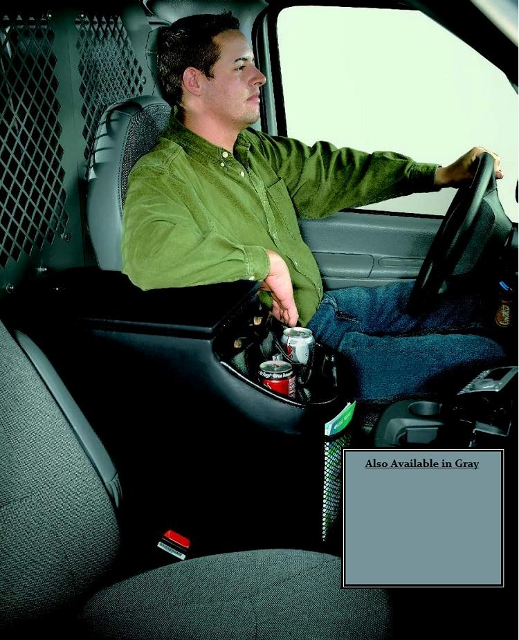 This console with locking lid fits between front seats and is deep enough to hold your laptop, manuals and business forms. Features 2 beverage holders as well as room for coins, CDs, iPods, iPhones and other small items. On this console, the lid opens to provide a writing surface and when closed, the lid doubles as an arm rest. Console measures 12 1/2"W x 23 1/2"D x 26"H and features a lockable rear compartment that measures 12 1/2"W x 23 1/2"D x 8 3/4"H and 2 net pockets in front that are perfect for storing maps or other paperwork. Covered with leather grain vinyl, this console comes in black or gray. Just make your selection above.