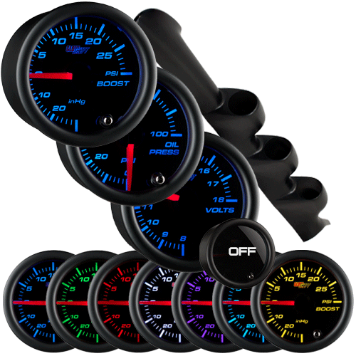 GlowShift's 94-02 Ford Mustang Hardtop Black Triple Pillar Pod Gauge Package allows you to select three 52mm Tinted 7 Color Series gauges that features seven color LED technology that allows you to change the backlighting color of each gauge. A magnified lens allows you to easily read and monitor your vehicle’s vital systems, and features an illuminated red needle that will sweep 270 degrees for maximum accuracy. GlowShift’s Tinted 7 Color Series utilizes electronic sensors and probes, ensuring all readings are extremely accurate. Seven solid backlight colors are included, as well as a color cycle and color fade mode, and a color recall feature is built into each gauge letting it remember the last color setting the gauge was on prior to turning the vehicle off. Mounting hardware and instructions are included with each gauge pod and each gauge includes any applicable sensors or probes, as well as instructions. A one year limited warranty and free technical support is included with every package.