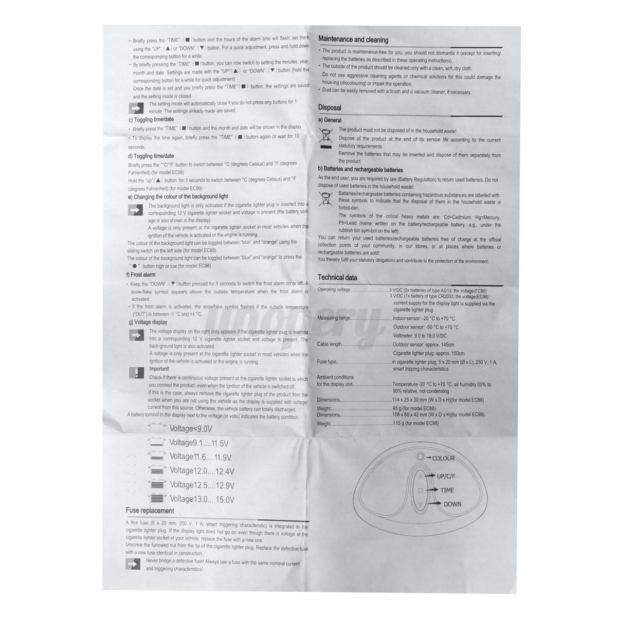 Measuring Range: -20℃~70℃(Indoor Temperature)/ -50℃~70℃(Outdoor Temperature)/ Voltmeter: 9 ~ 18V DC