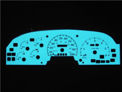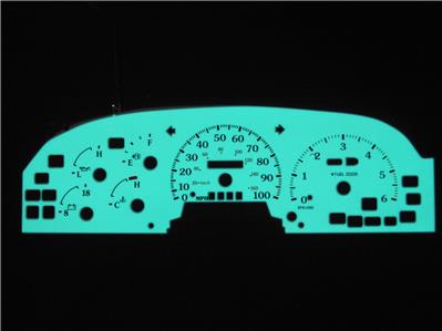 Description: White Faced replacement gauge faces with Blue/Green Luminescence at night