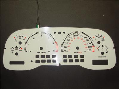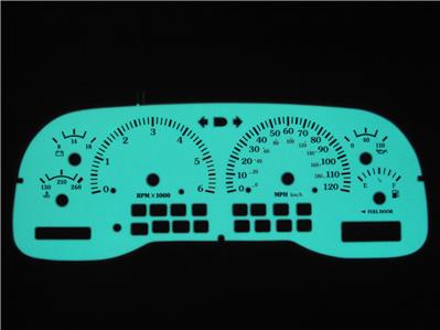 Description: White Faced replacement gauge faces with Blue/Green Luminescence at night
