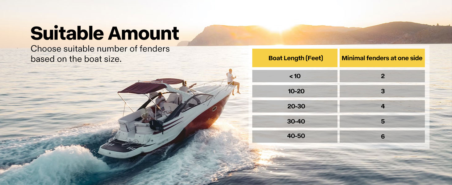 BOAT FENDER SIZE - The Boat Fenders measure 16.5 x 7.4 inches, catering to a diverse range of boat sizes; Generally, for boats with a length under 10 feet, it is recommended to use 2 fenders, while those between 10 to 20 feet usually need 3 fenders; Following this analogy, it is recommended to add one extra fender for every 10 feet increase in boat length to ensure complete protection