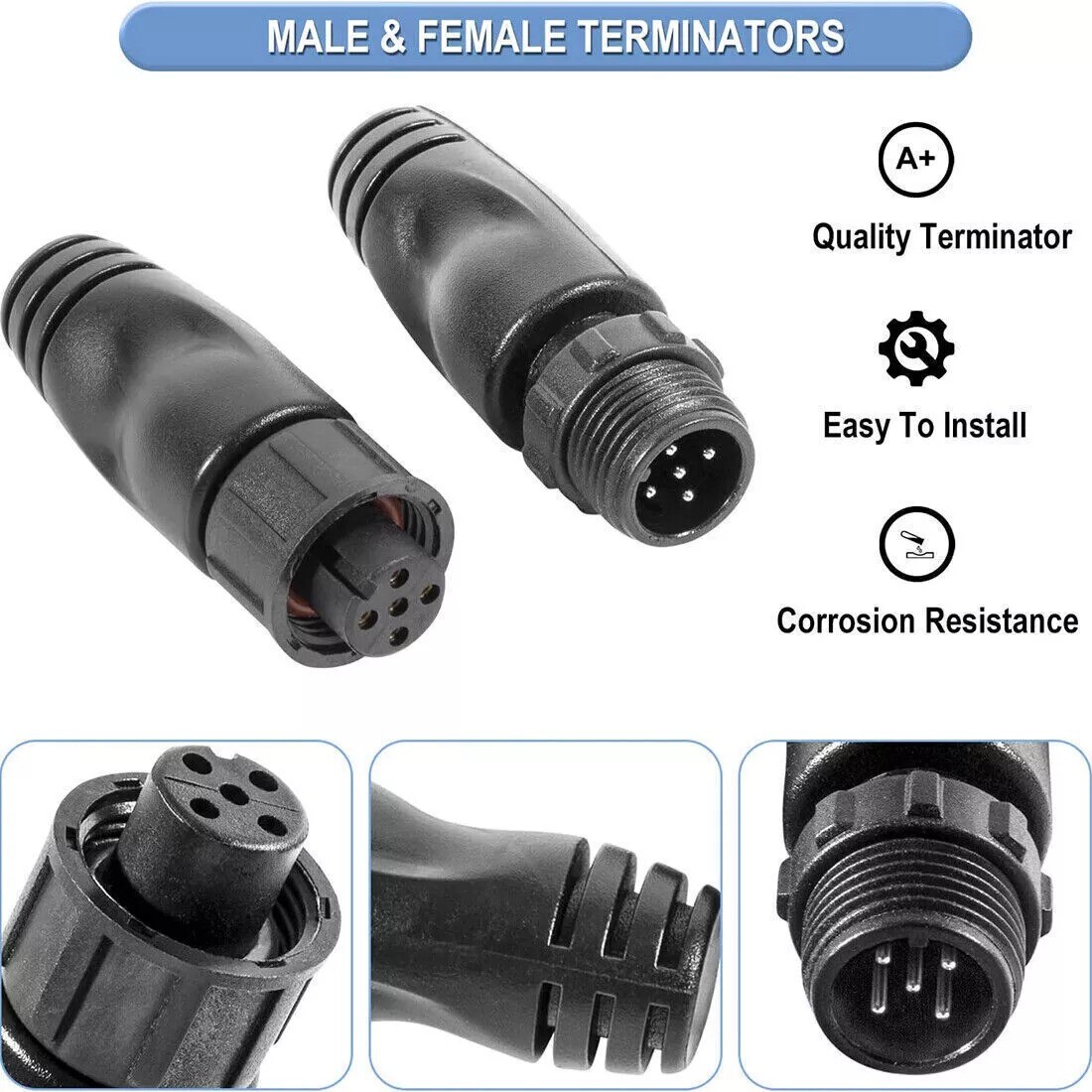 Performance--For NMEA 2000 N2K terminators are designed with A-Coding 5 pin, IP67 waterproof, for safety and high efficiency. Pair of male and female terminators are precisely manufactured with thread for M12, which allows to handle, plug and connect easily.