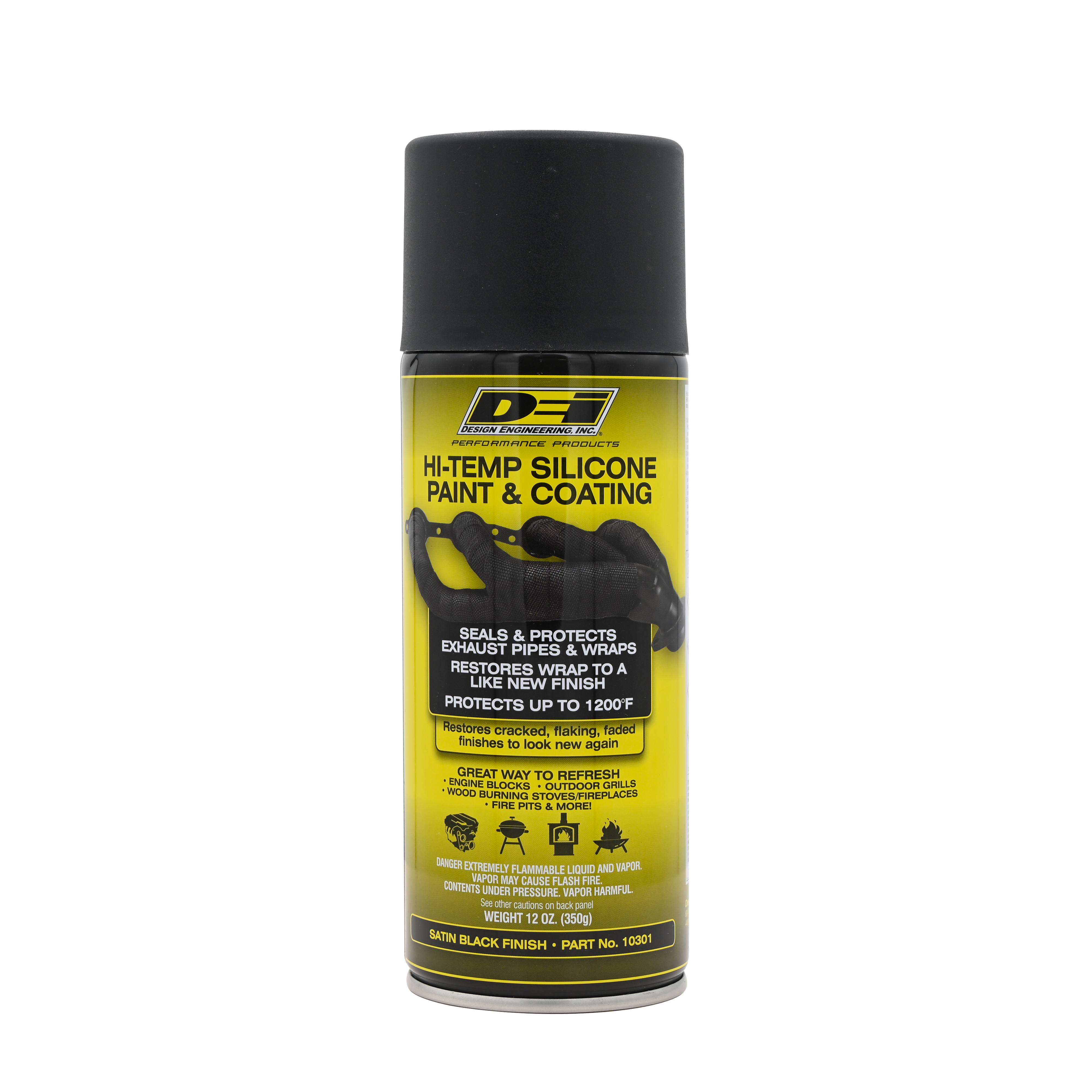Hi-Temp Silicone Coating Spray - Black HT Silicone Coatings solve the problem of exhaust wraps deteriorating because of dirt and debris hitting it. It seals and protects wraps and extends the life of the wrap. The High Temperature (HT) Silicone Coating provides lasting protection for any hot surface up to 1500 degrees. DEI recommend the use of this coating with their exhaust wrap because it seals the material and provides lasting protection from oil, dirt and road grime. Don't limit the use to exhaust header wrap, this products works well on headers, blocks, starters and even on your grill at home. HT Silicone Coating is VOC (Volatile Organic Compounds) compliant in all 50 states. For use with all DEI exhaust wraps, HT Silicone Coating penetrates, seals and protects as well as helping to extend the lifespan of all DEI exhaust wraps. See special instructions below for best adhesion on Titanium exhaust wrap products. Protection from abrasions, oil, and grime Withstands up to 1500F For use on exhaust wraps, engine blocks, pipes, manifolds & more 12 oz. can Cure temperature: 400F Cure time: 2 hours Titanium Application Instructions While not required for Titanium exhaust wrap, HT Silicone Coating will protect and prolong the life of the wrap. Due to the difference in material from glass fiber, HT Silicone Coating soaks into Titanium exhaust wrap's basalt fiber differently and needs a few coats and heat cycles for it to adhere properly. DEI recommends a minimum of three coats, each heat cycled for curing before applying the next coat. To cure, HT Silicone Coating needs to reach a temperature of 400F for approximately 2 hours. Allow to cool before applying the next coat. NOTE: HT Silicone Coating is sold in a compressed aerosol container. Regulations restrict the air transport of flammable products (aerosols). If you are outside the continental USA and are interested in purchasing an aerosol based DEI product, please contact our offices for further information at 1-440-930-7940. Heat Protection Up To 1500 Degrees F Seals- Protects And Prolongs The Lifespan Of Exhaust Wrap Protection From Abrasions/Hot Oil Spills / Road Grime Many Uses Around The Home And Shop 12 oz. Spray Can