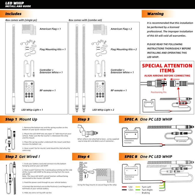 【PLUG AND PLAY】 Using the newest quick-release aluminum base and Plug-and-Play components, you can easily hang the led whip light anywhere. Quickly slide the aluminum base to release it, then drill a hole to place the LED whip, connect the battery cable, and finally use the RF controller for wireless control to switch to different modes and adjust the speed and brightness of the led whip light.