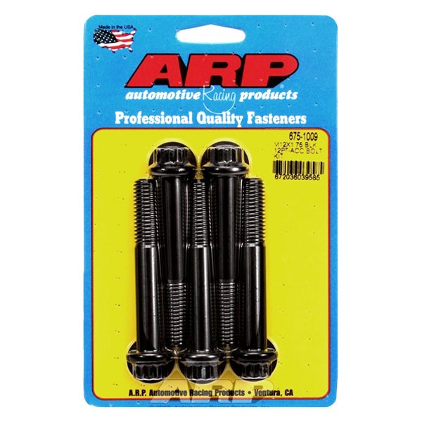 Universal, 12 Point Metric Thread Bolt Kit (675-1009) by ARP®. Finish: Black. Material: 8740 Chrome Moly. UHL: 80mm. Torque Value: 98 ft-lbs (132.9 Nm). Thread Size: M12 x 1.75. Wrench Size: 14mm. Quantity: Set of 5. Package Type: Skin. Designed utilizing the latest technology, this product by ARP features premium quality and will perform better than advertised. Perfect for your vehicle and lifestyle, it is manufactured to meet or exceed stringent industry standards.