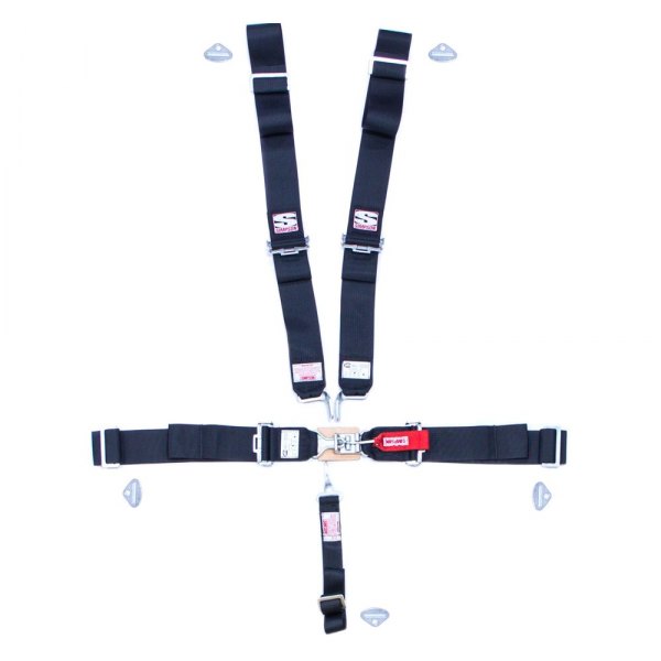 Universal Black Latch and Link 62" Pull Up Bolt-in Individual 5-Point Harness System (29061BK) by Simpson®. Belt made from Nylon. Simpson Sport Latch & Link belt system uses the same drop-forged alloy steel latch and link mechanism as their Standard Latch & Link harness and includes the same high-quality adjusters and pulls. The only difference is Sport harnesses have polyester webbing, which still offers maximum protection with minimum elongation and passes SFI 16.1 certification. Polyester straps allow for a lower cost for the budget-minded racer while maintaining the quality Simpson has built their name upon. This Sport racing harness belt system is affordable and adaptable to many race cars. Belts are pull-down with wrap around belt mounts but interchangeable bolt-in.