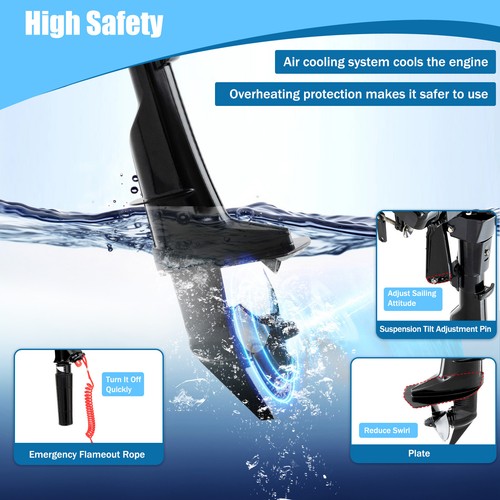 High Safety: The air cooling system helps cool the engine for longer life. Suspension tilt adjustment pins can be used to adjust the boat's sailing attitude at any time to keep it sailing smoothly. The anti-swirl plate reduces swirl, allowing you to sail more safely. The emergency flameout rope can help you to turn it off quickly. At the same time, it can also automatically turn off the machine when it overheats, making it safer for you to use.