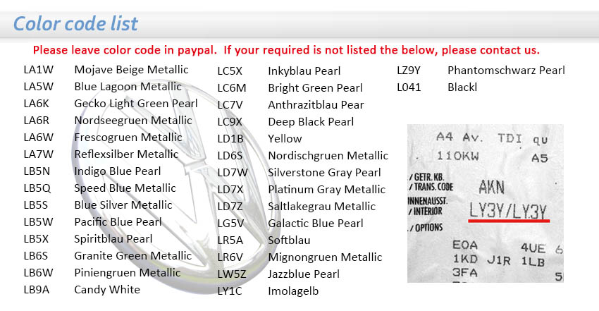 Please note code detail in PAYPAL receipt motes box. All factory color are available. If the color you required is not listed below‚ please contact us.