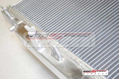 Complementing the line of high-performance upgrades and intercooler kits, GODSPEED Radiator were designed to provide maximum cooling efficiency to prevent premature engine failure. GODSPEED Radiators are full light-weight, high-heat transferring aluminum featuring a tube & fin design that dramatically increases surface area that enables the heat to dissipate more efficiently, the GODSPEED Radiator is 40% more efficient than stock. Complete with polished upper/lower end tanks and Temperature-Sensor Port, the GODSPEED Radiator aesthetically appeasing and a direct bolt-on application.