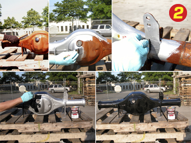 3) Ford 9" Rear - This 9" rear had a very tight layer of rust. The surface was wire brushed and a first coat of CHASSIS SAVER™ aluminum was brushed on and allowed to dry for 4 hours. Two coats of gloss black were then brushed on with 3 to 4 hours between coats. Rust will never see this metal again!