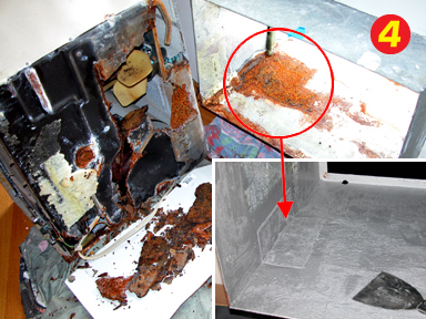 5) Rusty Air Conditioner Sleeve - This air conditioner in a beach-front location was removed from its sleeve only to find extensive rust damage that had all but disintegrated the housing of the AC unit. But worse yet, water had sat under the unit for so long that the sheet metal sleeve had corroded all the way through. As the rust was being scraped from the sleeve, the spot you see with the red circle fell apart and exposed a 220 volt electrical wire. On a Sunday afternoon without proper repair materials, a fast decision had to be made because a major storm was scheduled to arrive in less than 24 hours. A piece of 16oz painter’s drop cloth was cut with a 3" overlap of the hole. CHASSIS SAVER™ #934 Aluminum was brushed onto the metal surrounding the hole and the entire inside of the sleeve. This was allowed to set for about 2-1/2 hours. A second coat was then brushed on a bit heavy, and the drop cloth patch was laid over the hole into the wet CHASSIS SAVER™. The patch was then forced down with a 4" taping knife so the wet coating started to soak up into the cloth. A very light coat of Aluminum was then brushed very carefully over the patch making sure not to move it. Another 3 hours was allowed to pass and a nice medium coat of CHASSIS SAVER™ was brushed over the still soft patch. The following morning, a final wet coat of CHASSIS SAVER™ was brushed over the patch and the entire inside of the sleeve. The new air conditioner was slid into the sleeve 6 hours later and sealed with expanding spray foam. The storm hit hard 3 hours later. | | |