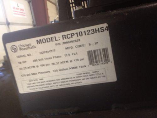 This compressor was purchased new about 10 months ago from A-1 Air Compressor in Addison IL. This was serviced by A-1 and professional maintenance personnel. This is great compressor- works perfectly. Use the Buy-It Now we will include the regulator and drain pump. Few details from OEM... The Chicago Pneumatic RCP-10123HS4 is a 10HP 120 Tank Compressor. Chicago Pneumatic durability and performance is world renowned. The Chicago Pneumatic Two Stage RCP stationary simplex compressors are available 10 HP to 37. 2 acfm . Aluminum head and coolers with deep fins allow for unmatched heat dissipation, while iron cylinders, iron valve plates, iron crankshafts, and stainless steel make a rock solid compressor. Balanced pistons and crankshafts mean smoother and quieter operation. Oversized main bearings and automotive style replaceable insert bearings for a durable, serviceable compressor pump. All units are 100% tested at full pressure. Features:Cast iron valve plates. Stainless steel reed valves. Solid cast iron cylinder. Heavy duty replaceable insert bearings. Oversized ball bearings. Balanced cast iron crankshaft. Deep finned cylinder head. Industrial grade balanced pistons. Easy access oil drain port. Easy to see oil level sight gauge. 10 HP / 460 Volt / 3 phase thermally protected motor. Magenetic starter required and it is not included on this model. 44. 5 cfm displacement. 37. 2 cfm at 100 psi 35. 4 cfm at 175 psi Fully enclosed belt guard. Start - stop pressure switch. 120 Gallon horizontal ASME/CRN certified tank and safety valves. Durable polyester powder-coated tank. Manual tank moisture drain. Discharge valve. Dimensions : 77 length X 26 width X 59 height X 705 lbs Recommended Chicago Pneumatic dryer # CPXHT-50 What's In the Box:Chicago Pneumatic RCP-10123HS4 10HP 120 Tank Compressor