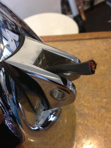 Chrome Billet Headlight With Halogen For Custom Look Oversized 7 1/2" Some pitting present around headlight and mount. 1" gap on mount. 12V 100/90W halogen light included. Light works well.