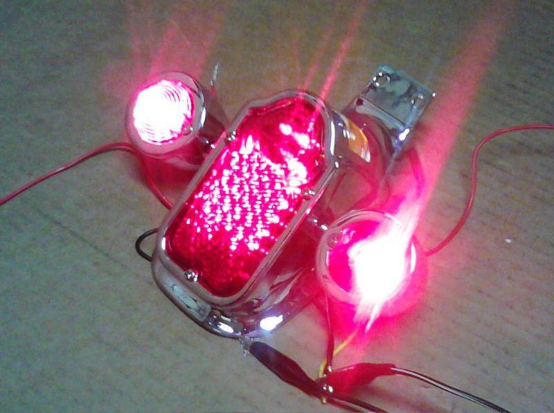 Here is a new in the package LED tombstone tail lamp and bullet turn signal assembly for Harley. This tail light will virtually fit on any rear fender, either set up for a stock tombstone, or any other curved fender. The tail light and turn signals are both LED style lights. The bullet lights are set up for dual usage, meaning you can run these as running lights with turn signals, or you could even set them up as a three light brake light, for them areas where there are a lot of blind drivers that like to rear end people. The extra brake lights sometimes helps these people see you better. Buy this neat light set up and clean up that rear end of your custom Harley!!!!