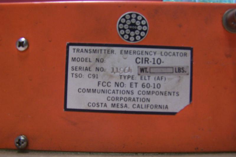 This is a Communications Component Corp. Transmitter, Emergency Locator TR 70-17. I was not able to test the unit and im not sure if it is missing any pieces so i am selling it as is. It has some cosmetic wear from use and storage but still seems in good shape. There are operating instructions on the top of the unit and a side sticker that reads; Transmitter, Emergency Locator, Model Number CIR-10, Serial no: 11964, Type: ELT (AF), FCC No: ET 60-10, Communications Components Corporation, Costa Mesa, California. On the other side it has a sticker that reads Transmitter TR-70-17. Please see pictures for more details of the condition of the unit. If you have any questions please feel free to ask. Thank you for your interest in this post.